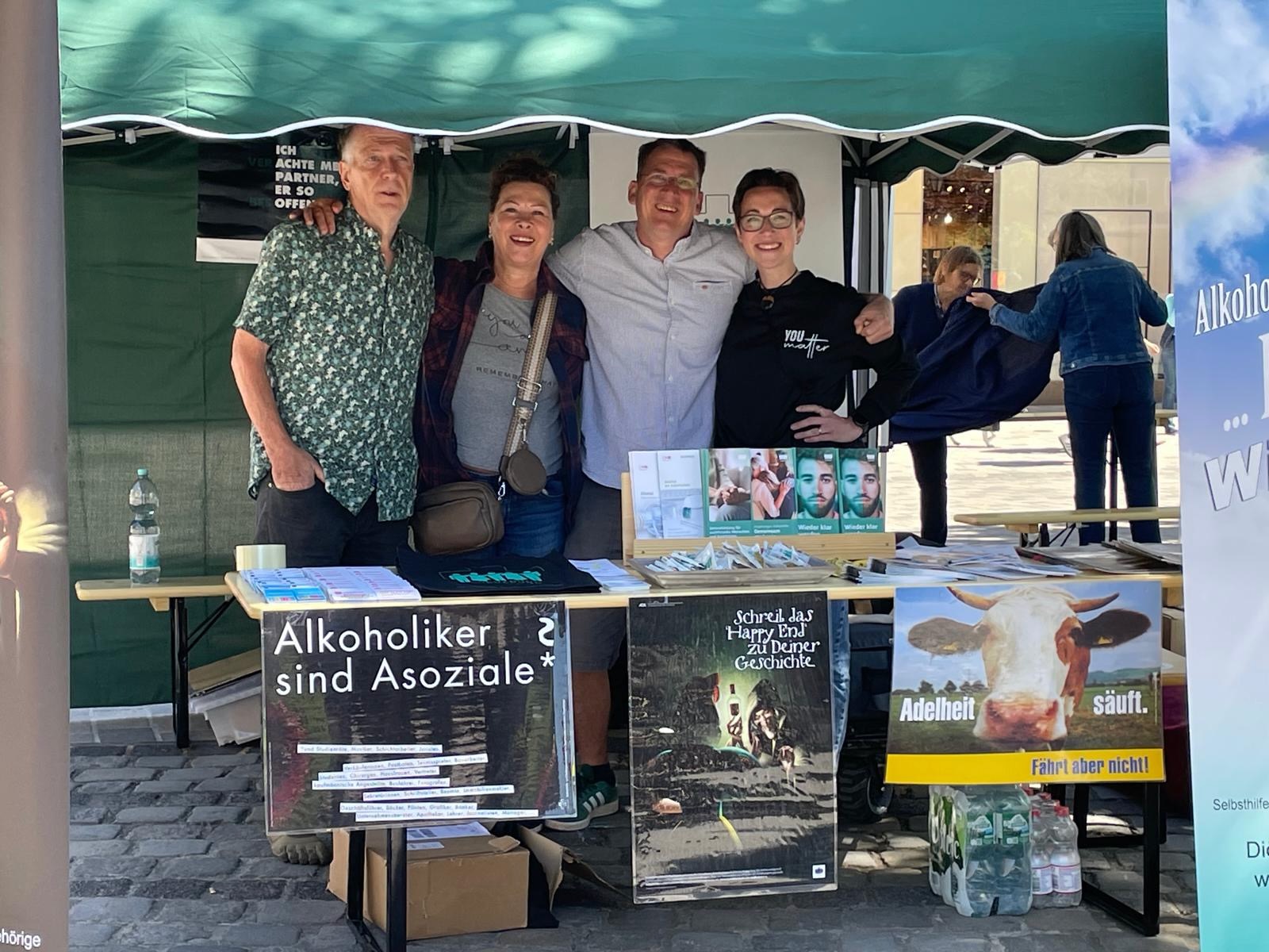 In gelassener Mühelosigkeit stellten wir in Teamarbeit den Pavillon auf, und das Aufstellen der Roll-ups ging auch im Handumdrehen. Noch ein paar Poster aufgehängt, unsere tollen neuen Kreuzbund-Flyer in den Aufsteller – und schon waren wir im Geschäft.